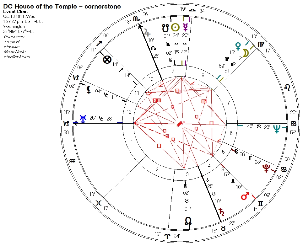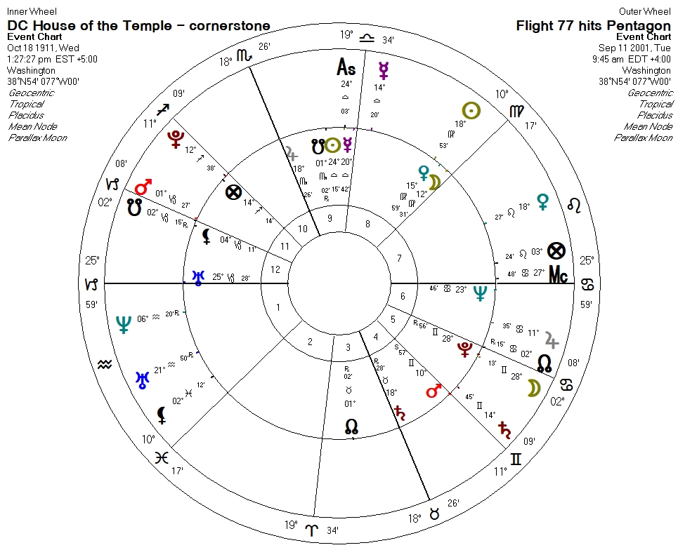 We can see that the Ascendant of the Pentagon element of 9/11 is conjunct the Sun of the Temple cornerstone, and that 9/11 Saturn is opposite Temple cornerstone Part of Fortune, though we should remember that the Temple cornerstone chart is hypothetically timed to coincide with Jupiter and Saturn on the meridian. (We can also see that 9/11 Moon is conjunct Temple cornerstone Pluto, remembering that Pluto was unknown to the world in 1911).