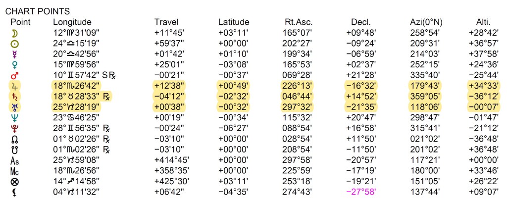 The measurements (from Solar Fire) for the chart above are as follows, with the planets highlighted. The last four columns are important: