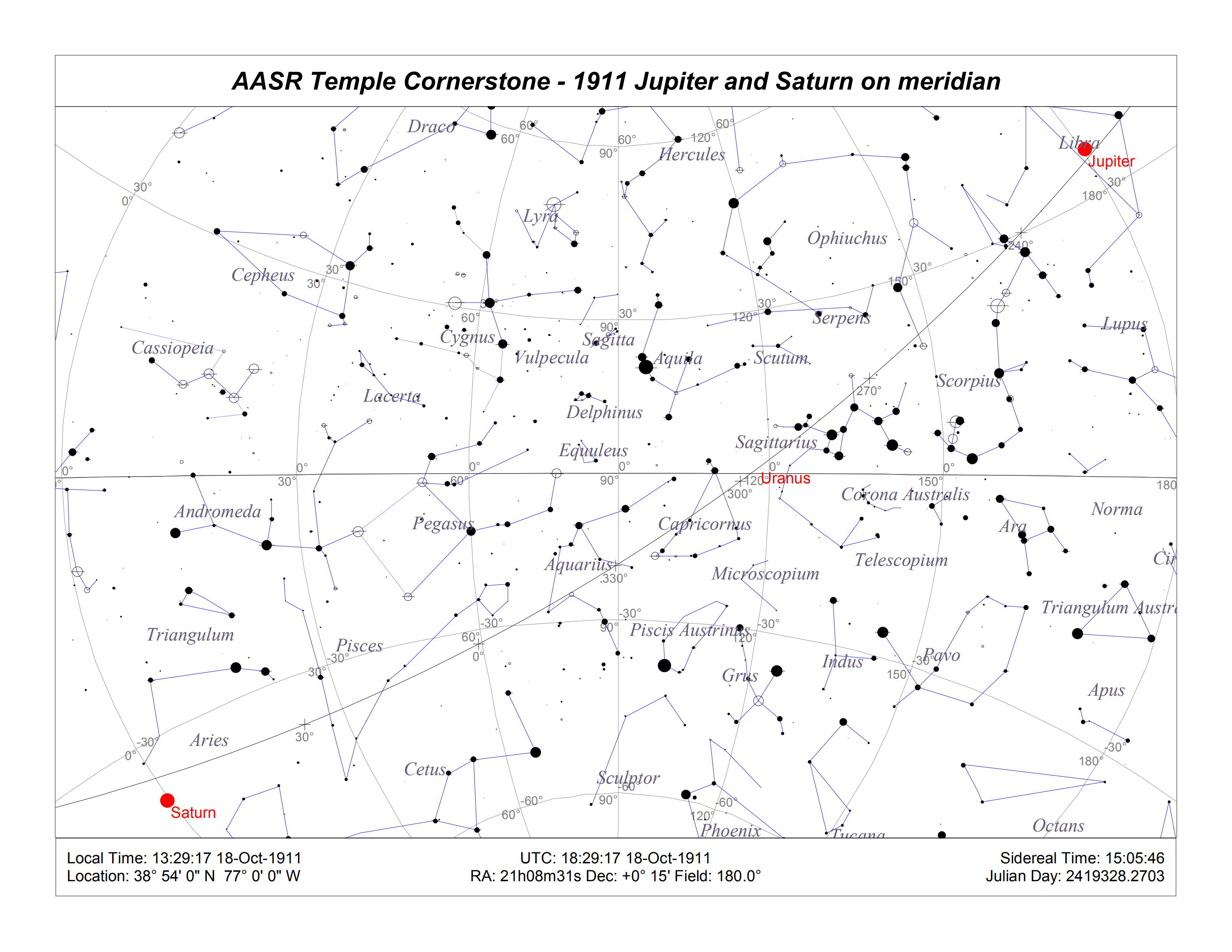 We left off in the last part with a nifty sky map for the date the AASR laid the cornerstone of their temple (not a lodge, but a temple) in Washington DC, which was October 18, 1911: