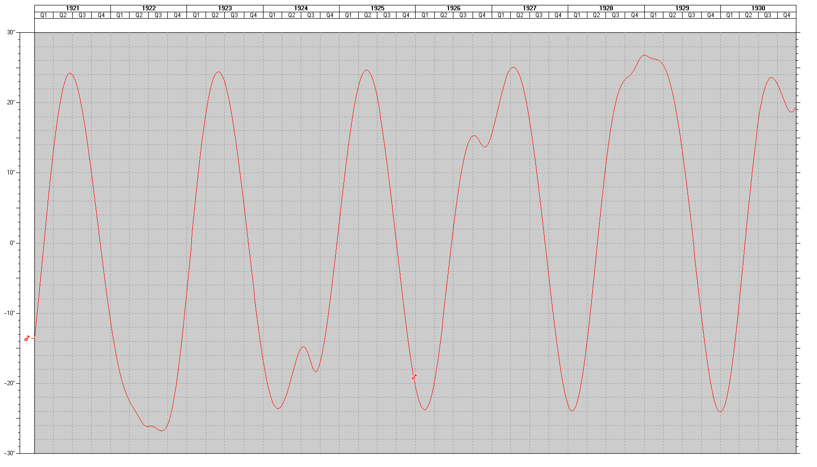 The astronomical term for the peaks and troughs of a declinational curve is a “standstill,” and the standstills in 1922 and 2001 are more prolonged than in other years, and these tend to make the turn northward in September of both years. The big question is, then: were the planners of 9/11 knowledgeable of this, and could this have been factored into any elective astrology that might have been used?