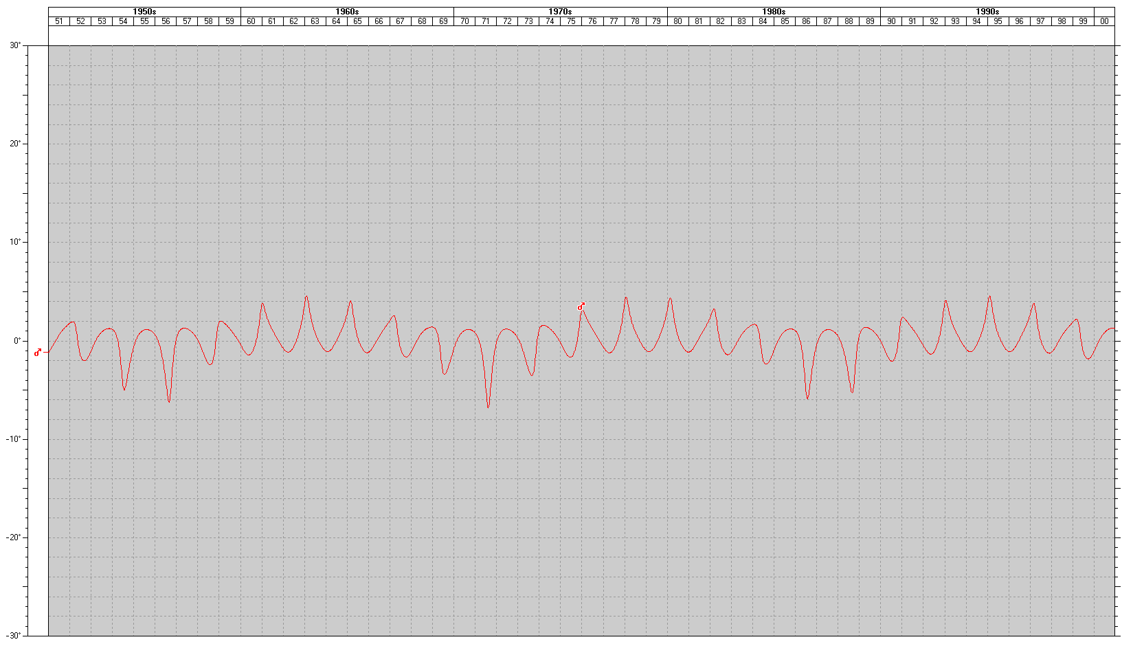 A comparison of these two graphs reveals that Mars makes similar treks at 79-year intervals, as would be expected with our 79-year rule. A closer look reveals that not all peaks and troughs are smooth curves. The two troughs in 1922 and 2001 have somewhat rough curves, and are both more than two degrees greater in value than the average peak and trough.