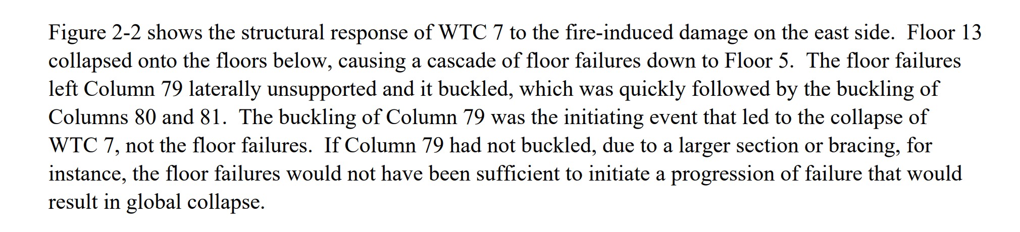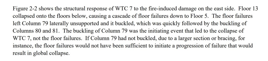 While I am hardly equipped to challenge the chapter and verse of the NIST report, it is my contention that the report’s dependence on “Column 79,” and the theoretical acrobatics used to focus on this column, constitute a big “FU” to the public.