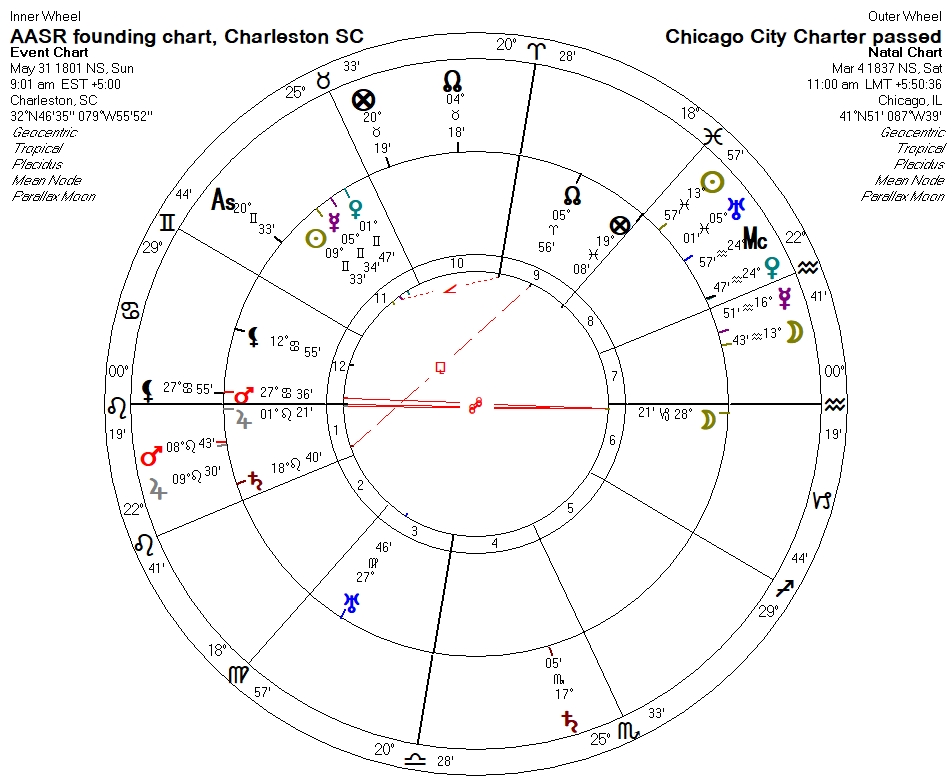 (Note that Jupiter is ~8° advanced along the ecliptic, on the other side of Cancer, to account for the +8° change in latitude between Charleston and Chicago.) Can there be any doubt as to the importance of Sirius in the ritual astrology of this group? The bi-wheel for the two events is as follows (Venus on the MC for the Charter is a guess by me):
