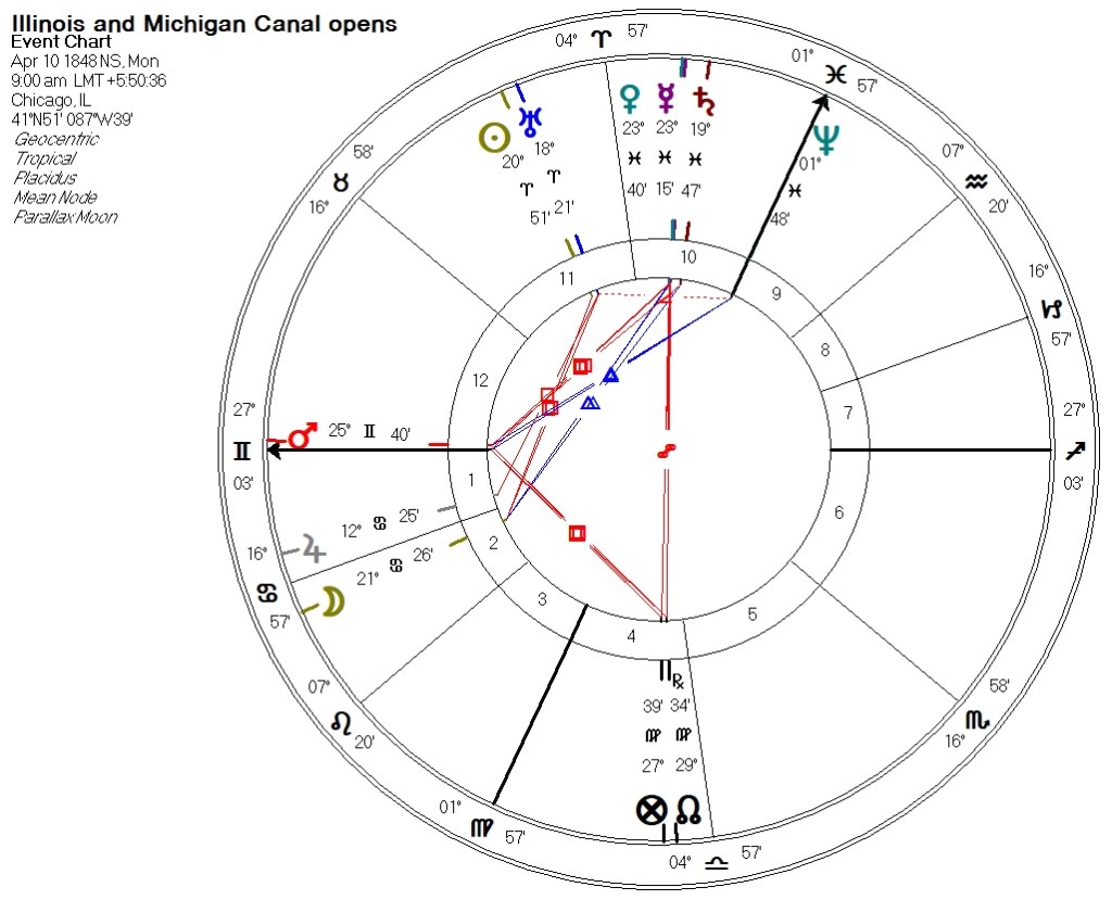 The Sirius-Jupiter connections mentioned earlier are evidence of a ritualistic astrological effort, but the I & M Canal becomes astrological, I suppose, when Jupiter (12°24′ Cancer) is conjunct Sirius (11°59′ Cancer) at the official opening in 1848. In terms of “straight” astrology, the whole enterprise is Jupiter and Merc in combination, or JU/ME. Given that Venus is conjunct Mercury in the 1848 chart, it’s a good thing for networking.