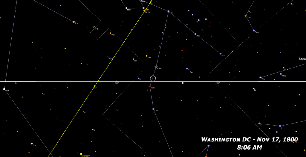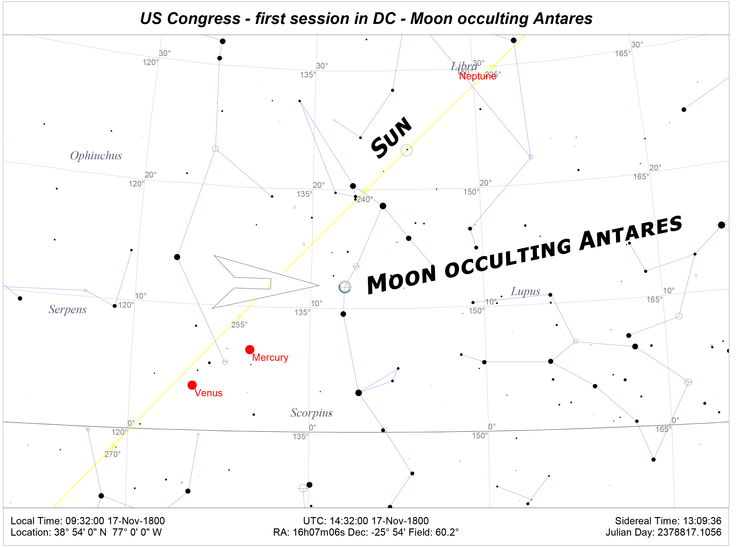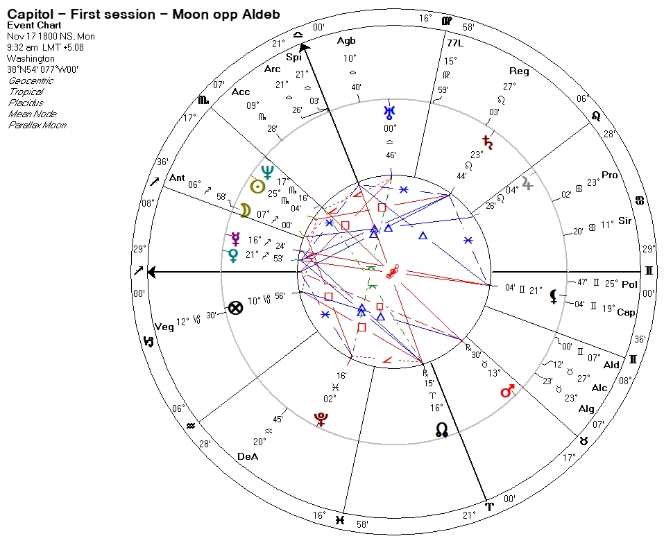 If we run a chart for that date of the first session – November 17, 1800, we find that, at about 9:32 AM, Luna is exactly aligned with Aldebaran, but at the famous opposition star called Antares:
