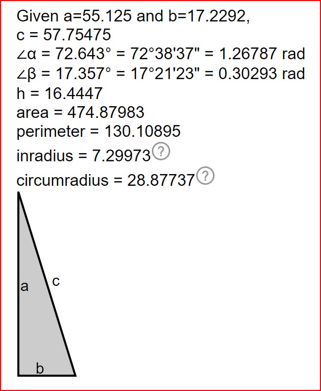 If we toss these numbers in a right triangle calculator, we get this, showing that the slope of the pyramidion is 72°38’37”: