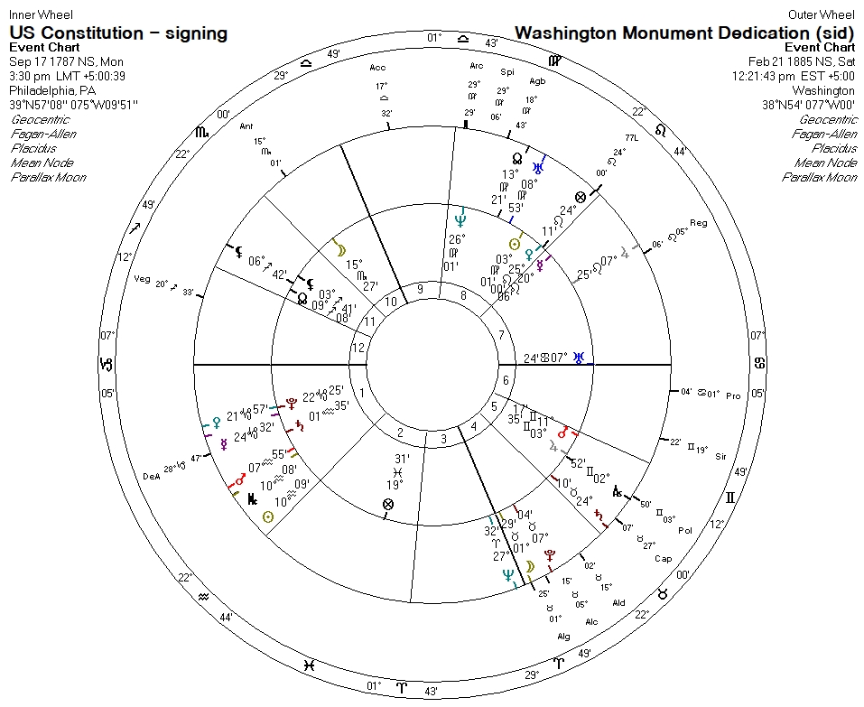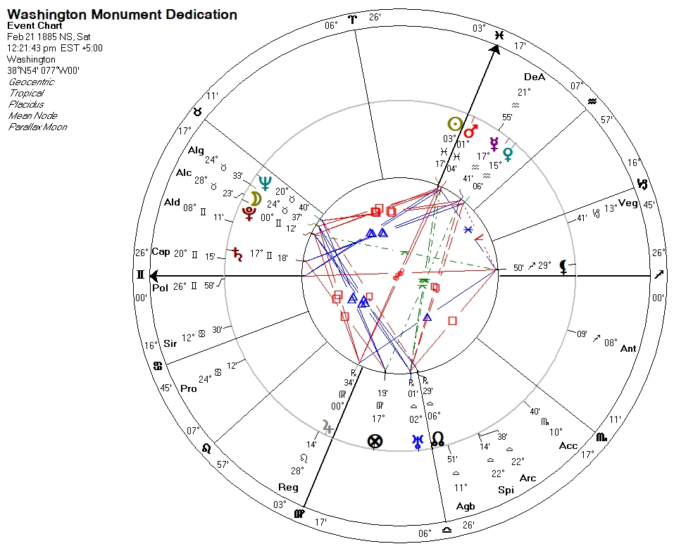To summarize, we have learned here that some of the astrology of the Washington Monument has elements that relate to the timing of the first session of Congress in Washington DC, the Constitution, and Speculative Freemasonry; we glean this through discovering a special arrangement of stars that are related to the slope of the pyramidion at the top of the structure. One might conclude that there was some serious astrological work going on behind the scenes through all of these dates. Such is the point of my little blog – to unpack everything and demonstrate how astrology played a big role in the USA’s creation and evolution.