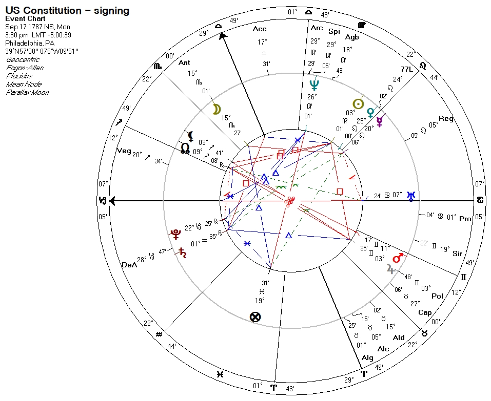 Luna with Antares/Aldebaran is featured in one other important USA chart – the signing of the US Constitution in Philadelphia.