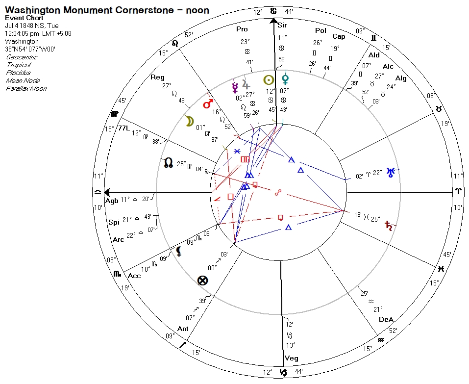Yet, the astro-mathematics of the WM surrounding July 4 has to do with a historical picture that transcends the freemasons or even the so-called “new world.” A default noon chart for this cornerstone ceremony (which was symbolic only; the actual placement took place on a different day) is as follows: