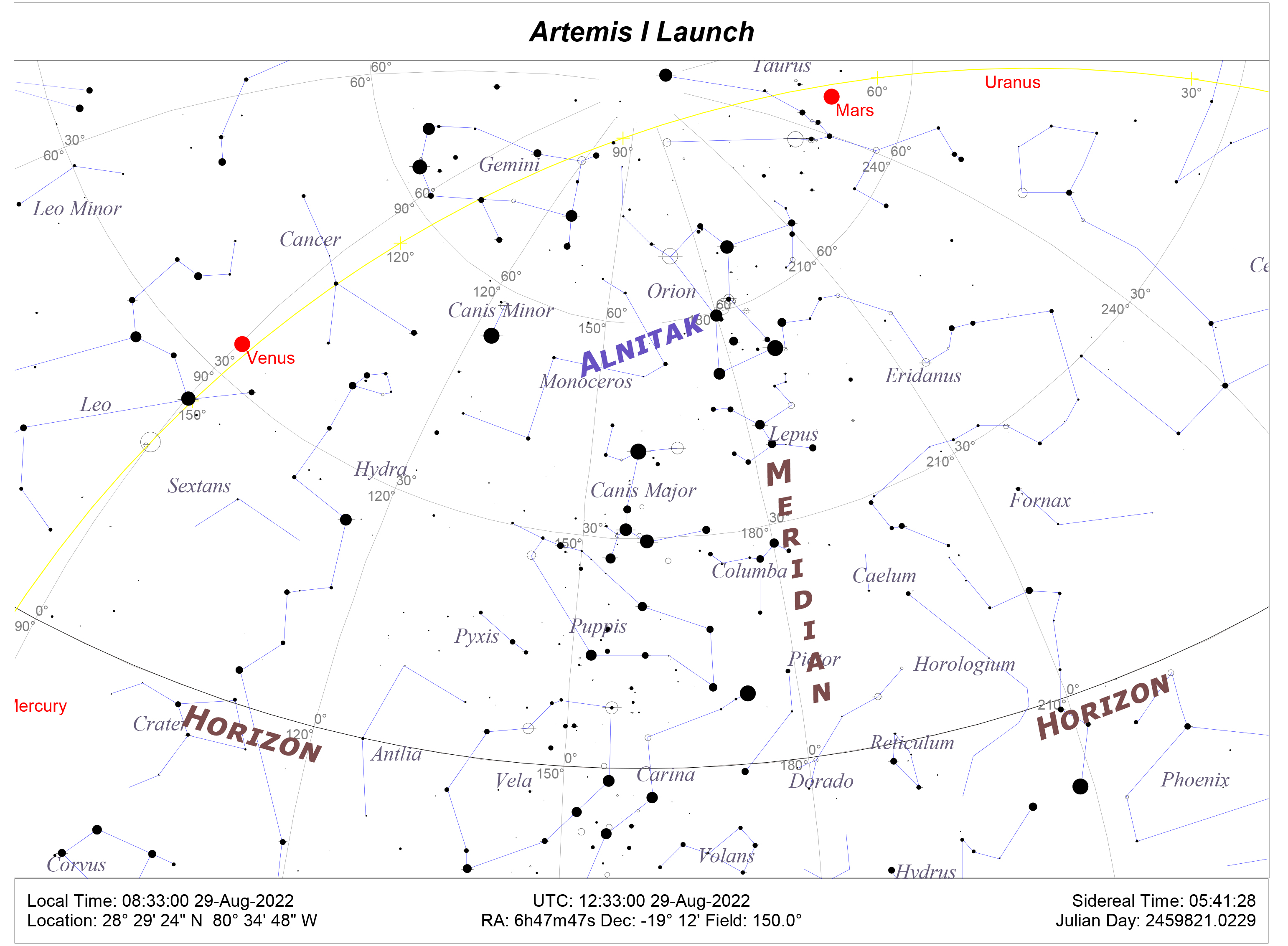 The meridian line (the arc from north to zenith to south) as measured from from Cape Canaveral is being transited by Orion, notably the belt stars, and more specifically, the third belt star – Alnitak – the so-called “Great Pyramid Star.”