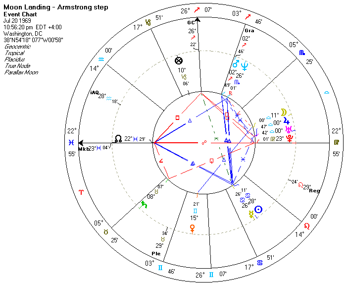 Digging up a blast from the past, my original chart casting for Neil Armstrong’s giant leap for mankind, we find that the moment relocated to Washington DC has some uncanny alignments, notably the Galactic Center on the meridian, Mars conjunct fixed star Graffias (in the head of the Scorpion, part of what I used to call the Masonic Square), and the fixed star Markab (alpha Pegasus) on the ascendant: