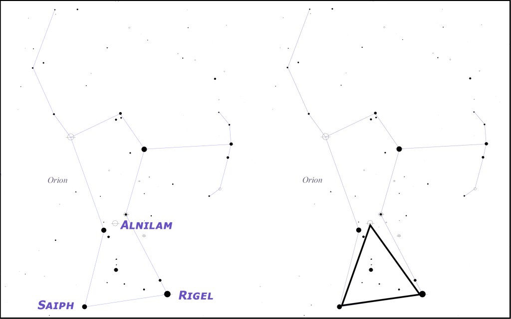 The triangular “A” also fits in Orion geometrically, as the stars Saiph, Rigel, and Alnilam form a nearly perfect equilateral triangle: