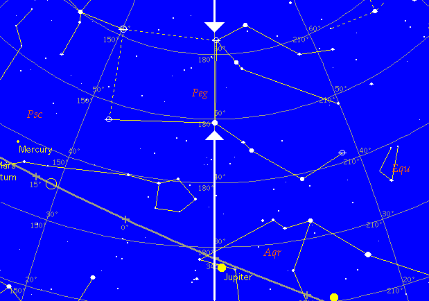 When we relocate this chart to Rosslyn, we find that Jupiter is culminant, but more importantly we see the Markab, the corner of the celestial square, is exactly on the meridian!