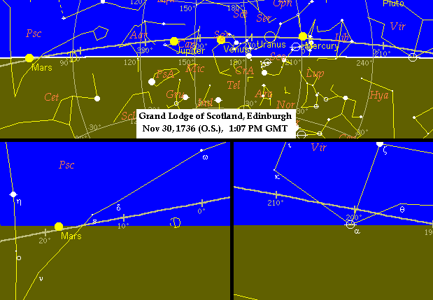 Here we have a definite date for the lodge founding, and we can see that indeed Mars, Luna, and Spica are on the east and west horizon over Edinburgh for this date (December 11 in New Style format):