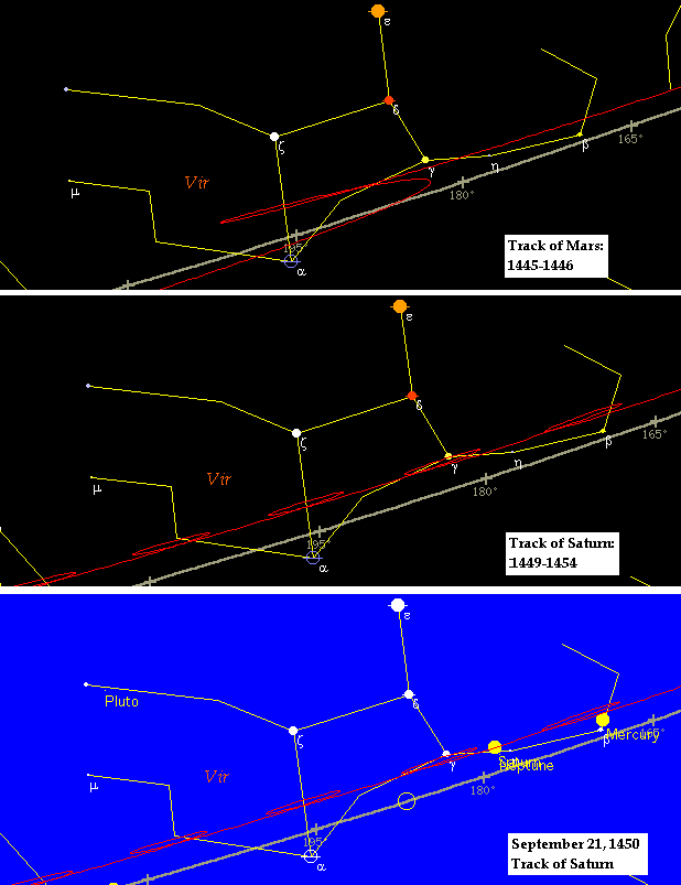 But, why use a Mars/Saturn conjunction, which is viewed as highly unfortunate in contemporary astrology? Perhaps it has to do with the track of Saturn in 1450 that takes a similar trek to Mars’ path of 1446: