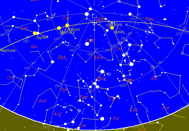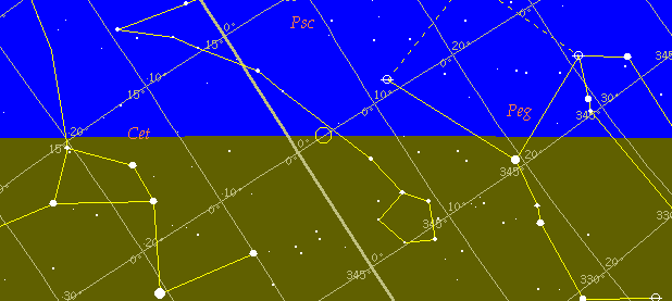 This lunation is exact to an amazing 13 seconds of time, as is depicted in the closeup sky chart, centered on the local Zenith: