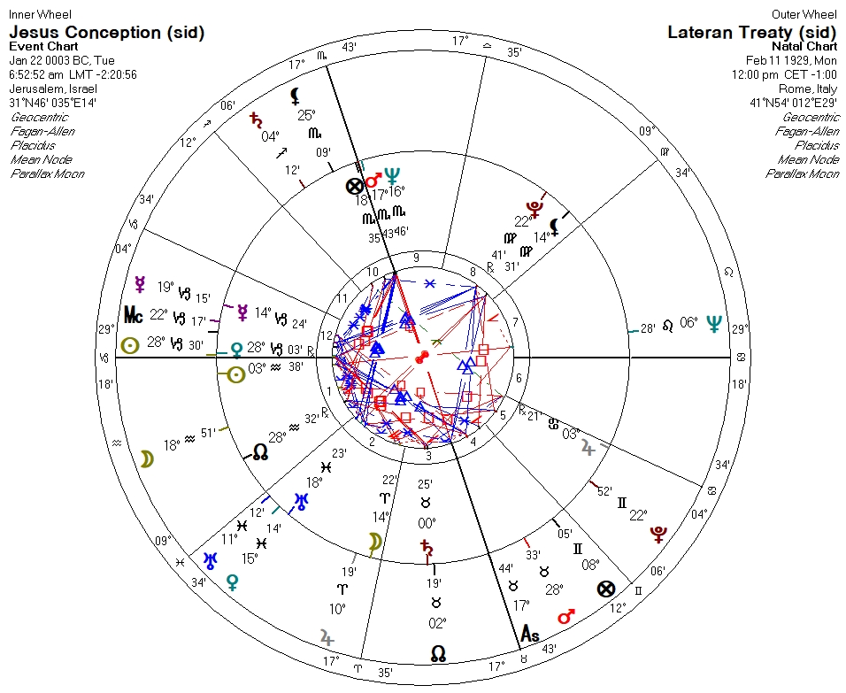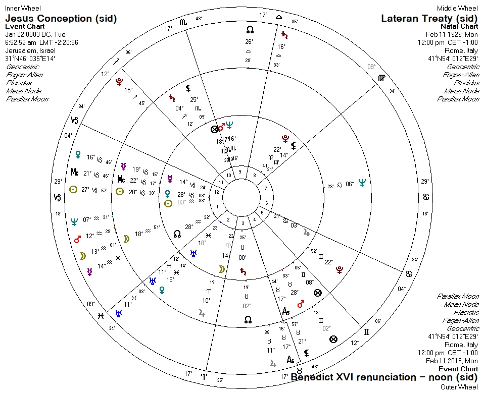 The connection between the renunciation of Benedict XVI, the Lateran Treaty, and the Jesus Conception charts are obvious. At the ascendant on the left, we find Conception Venus at 28°03′ Capricorn, Lateran Sun at 28°30′ Capricorn, and Benedict XVI renunciation Sun at 27°57′ Capricorn: