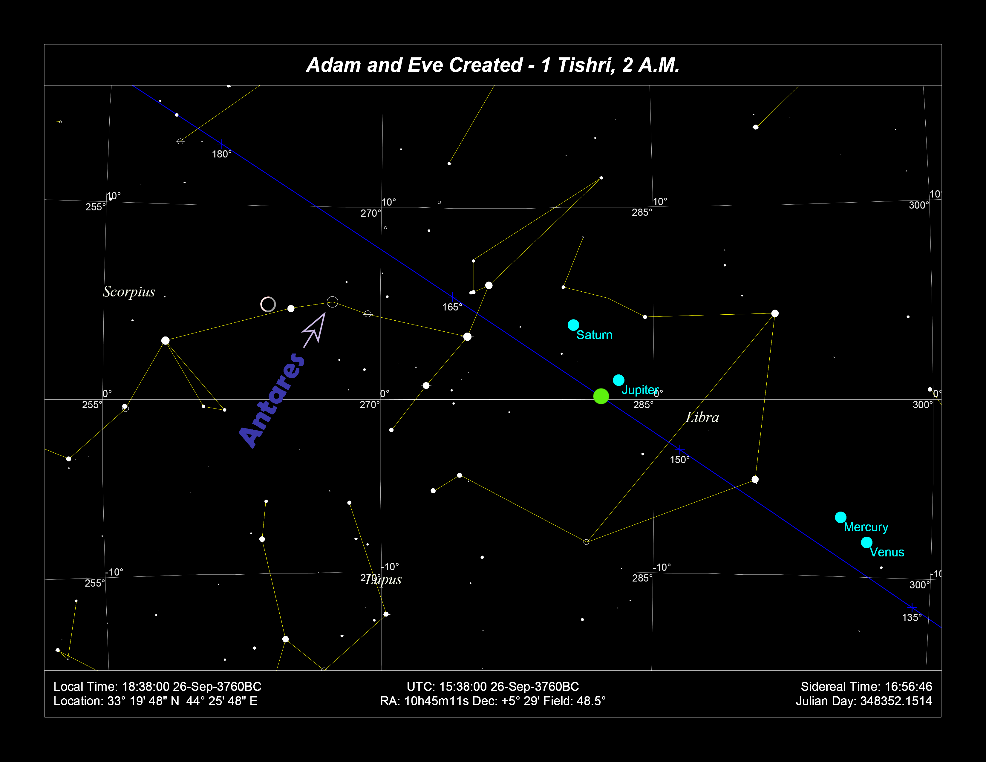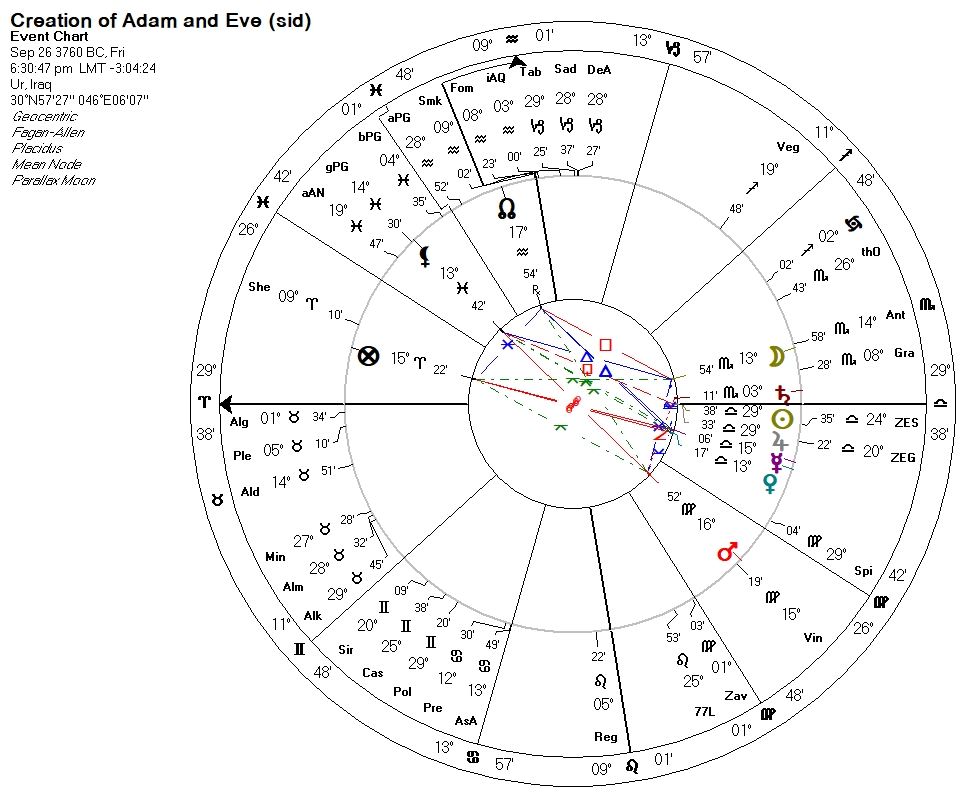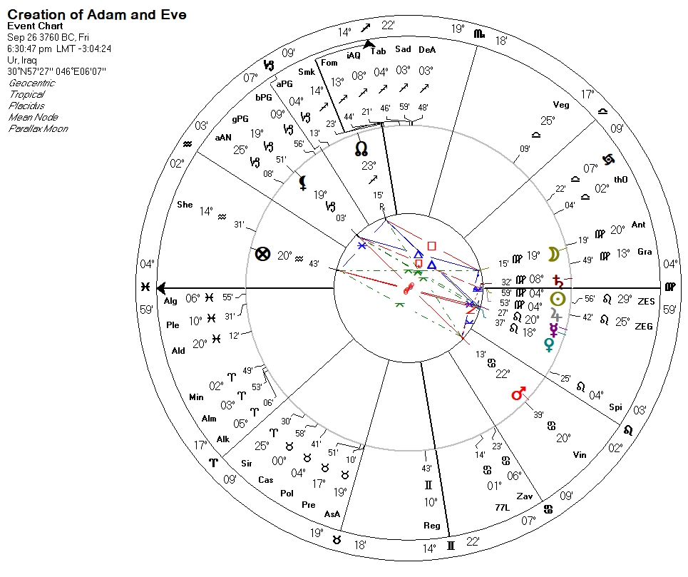 The Hebrew chronology that gives us the Anno Mundi year count puts the creation of Adam and Eve on the first “New Year” – the first Rosh Hashanah – a date equivalent to proleptic September 26, 3760 BC. The chart for this mythological event is the important one in this quest to understand the charts of modern Judaism and Israel. This chart is given next, cast for sunset, with the Sun on the descendant, in the tropical zodiac: