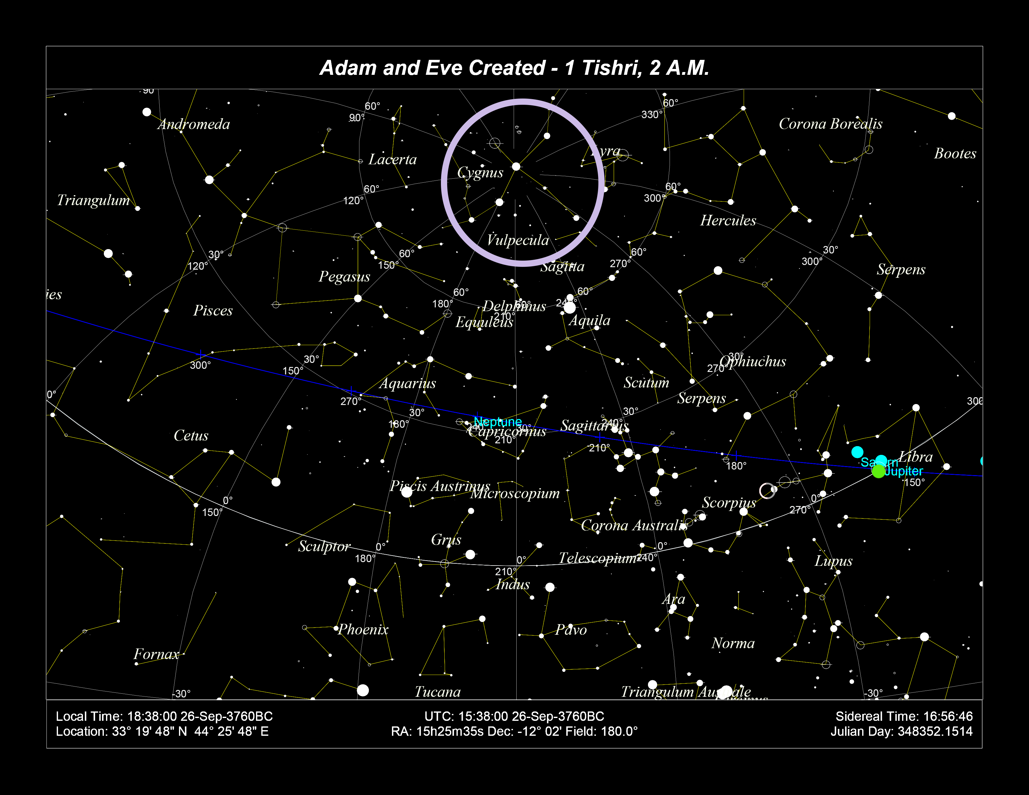 The fixed star “Gra” that is conjunct the new moon is Graffias, the bright star in the “head” of the Scorpion. Thus, the creation of the pre-creation chaos was in Scorpio. Just above that, we see Saturn aligned with “ZES” and Mercury with “ZEG,” which are the fixed stars Zubeneschamali and Zubenelgenubi, respectively – the stars of Libra, though formerly the “claws” of the scorpion figure. I find this to be very interesting as the exaltation of Saturn is in Libra. We also notice Venus within one degree of the fixed star Vega.