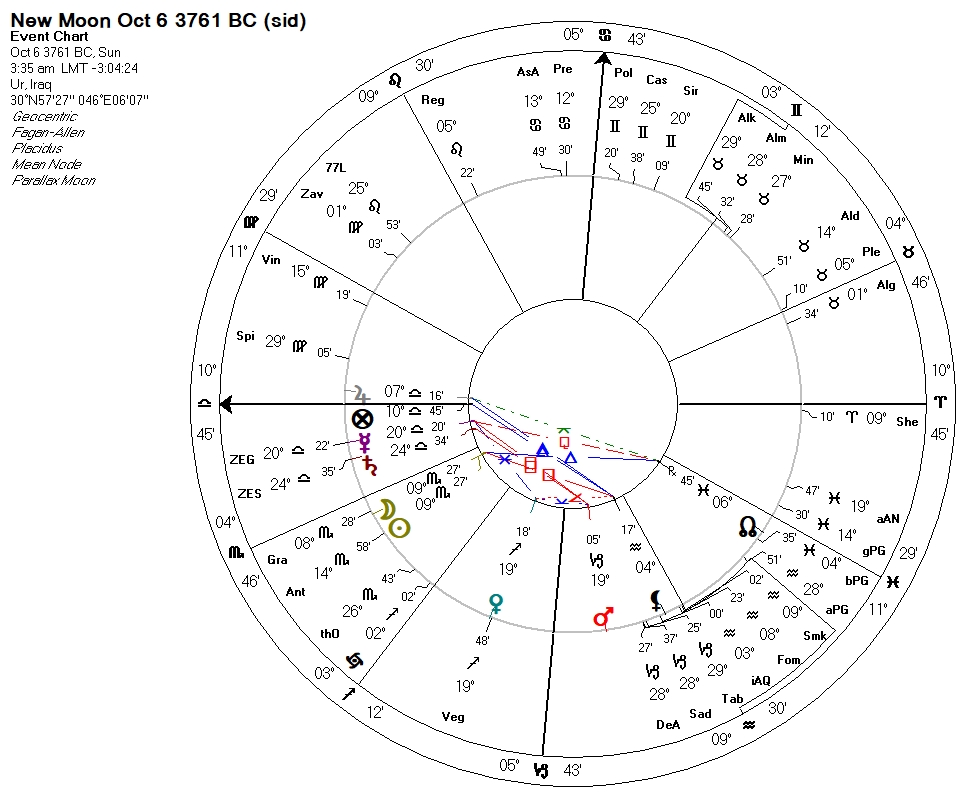 nb: Moon positions in charts for 5000+ years ago are impossible to calculate with an accuracy of less than a few degrees of longitude, even with computers and the best NASA ephemeris, due to the unknowns of Delta T. The positions calculated by Solar Fire may be off by a tad from what the actual position was for an observer in the fourth millennium BCE.