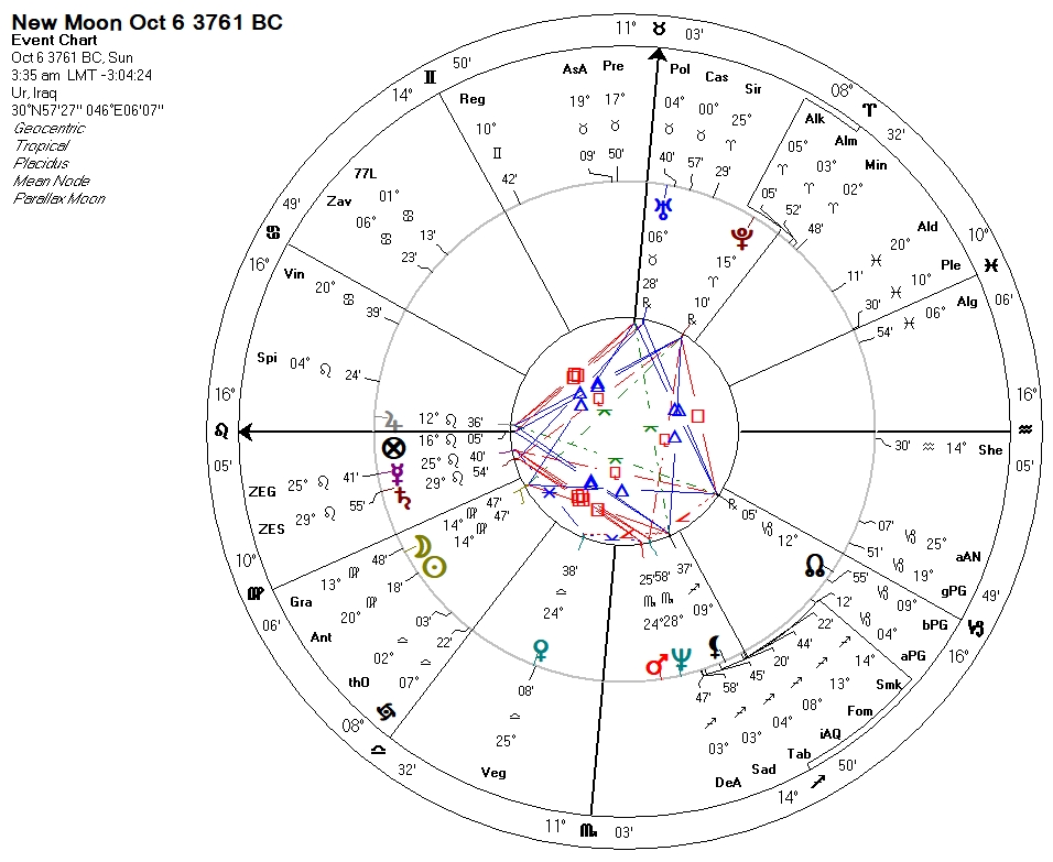 ben Halafta concluded that there was a new Moon in the 15th degree of tropical Virgo in the proleptic Julian calendar year of 3761 BC, and this is the chart: