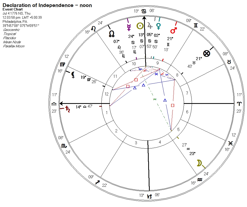 Back to the chart, we also see that there is a Sun/Saturn square, almost perfect, with perfection taking place around 7 AM local time. Where else in our mundane gallery of political charts do we find such a tidy Sun/Saturn square? The answer, of course, are two places: