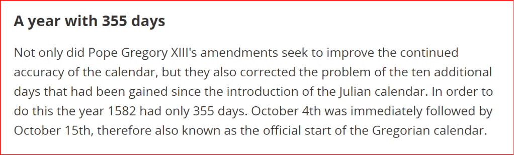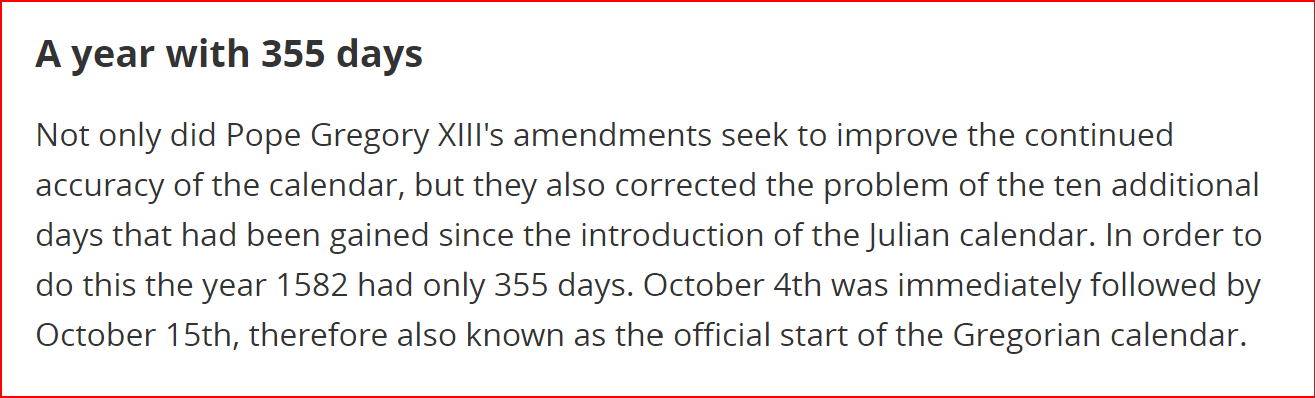 As a final note here, I want to point out that the Gregorian reform was not adopted by the English until 1752; the Crown mandated that the year 1752 would have a September with 11 less days, leaving 19 days. Because 1752 was also a leap year, the total number of days was also 355.