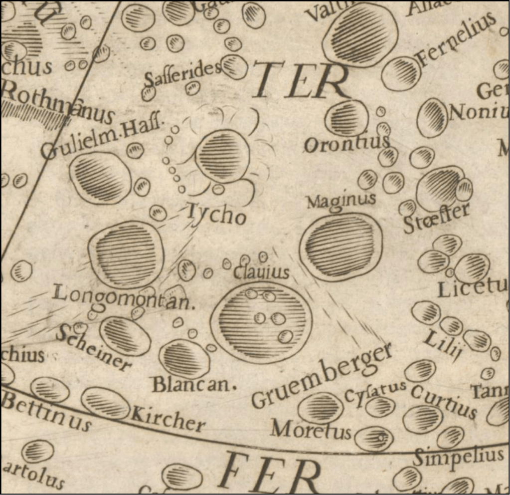 While it looks small here, Tycho is perhaps the most prominent crater on the Moon, given the bright rays of ejecta around it. (To be sure, Riccioli gave Kepler a crater as well, near the area reserved for Copernicans.)