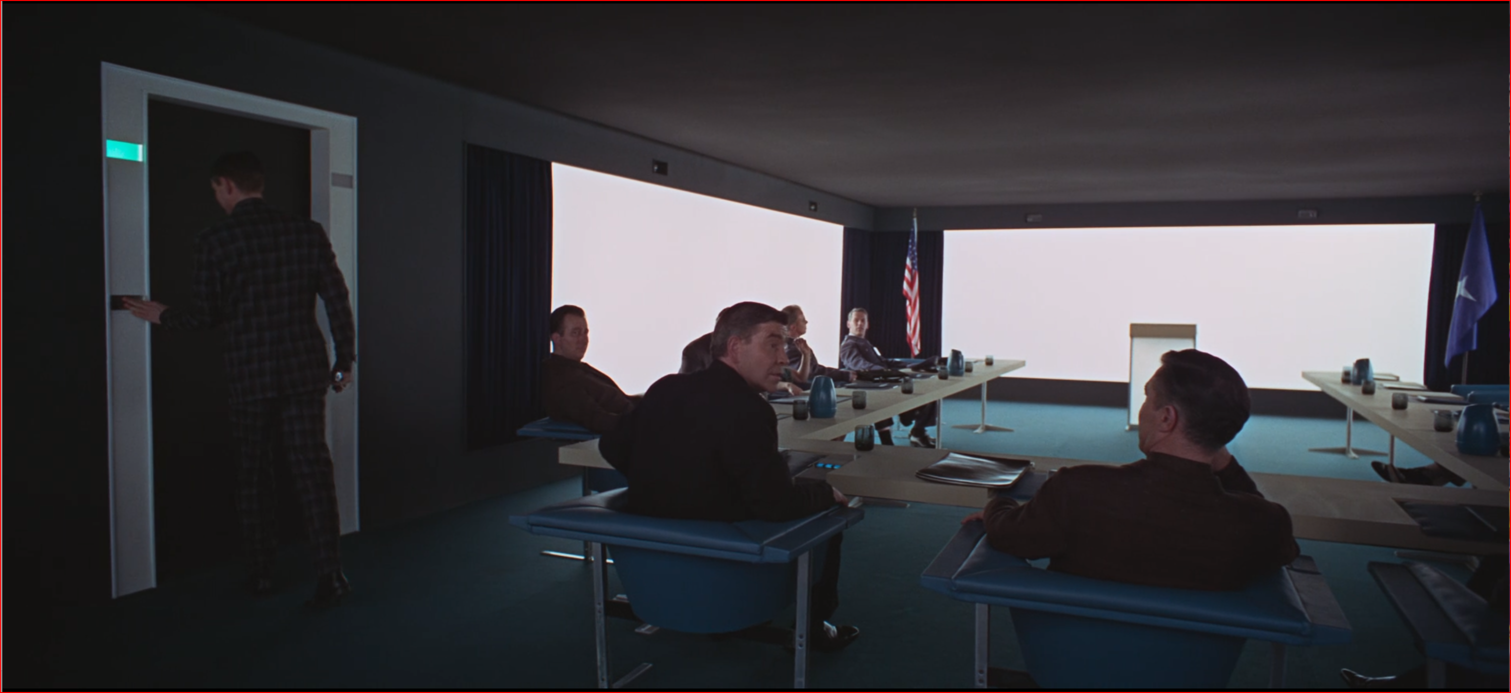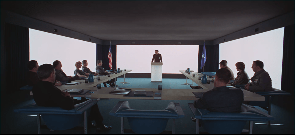 Soon after, we find Dr. Floyd in the conference room on Clavius Crater. Here is where the symbolism comes together. Notice that the room is surrounded by white rectangles, evoking the dimensions of the Monolith, and talking to 11 other people: