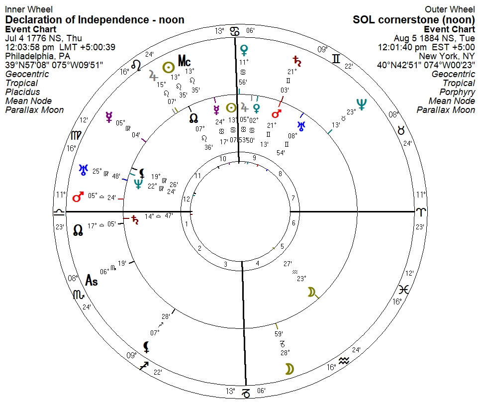 As mentioned earlier, the tablet in the left arm of the statue bears the date of Independence, and so a quick look at both charts is in order: