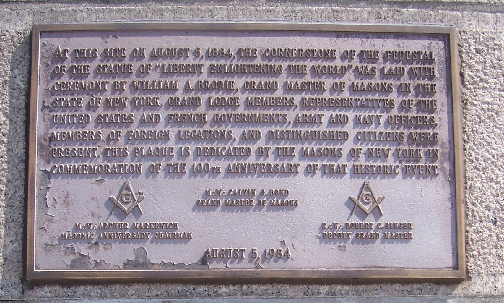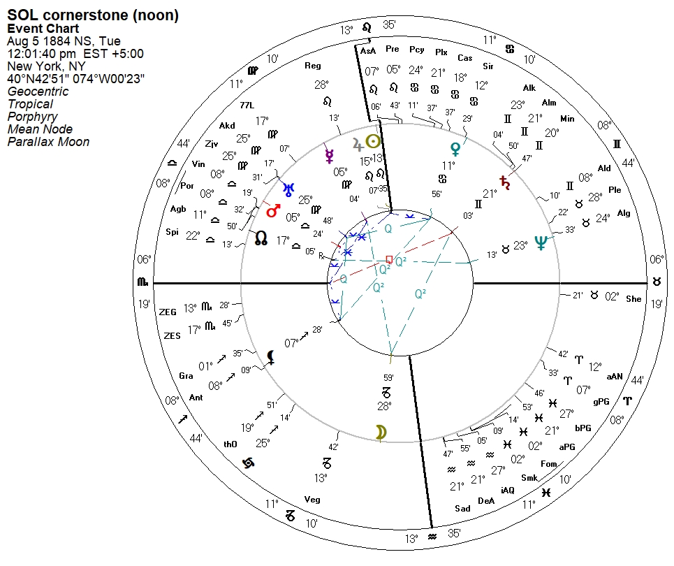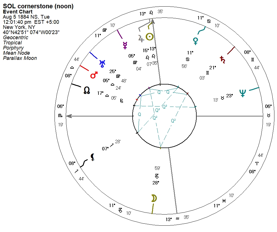 As can be seen in the above plaque donated by the New York Grand Lodge, the cornerstone was placed in a Masonic ceremony on August 5, 1884. This date was obviously chosen for one reason: it was the date of the heliacal rising of Sirius at that location in New York.