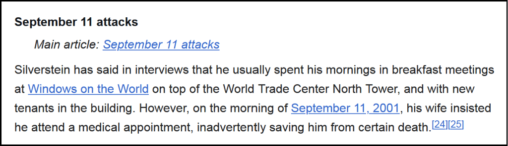 I would note that Building 7 was owned by Silverstein well before the 2001 lease. “In 1980, Silverstein won a bid to lease and develop the last undeveloped parcel from the Port Authority of New York and New Jersey, to build the 47-story 7 World Trade Center.”
