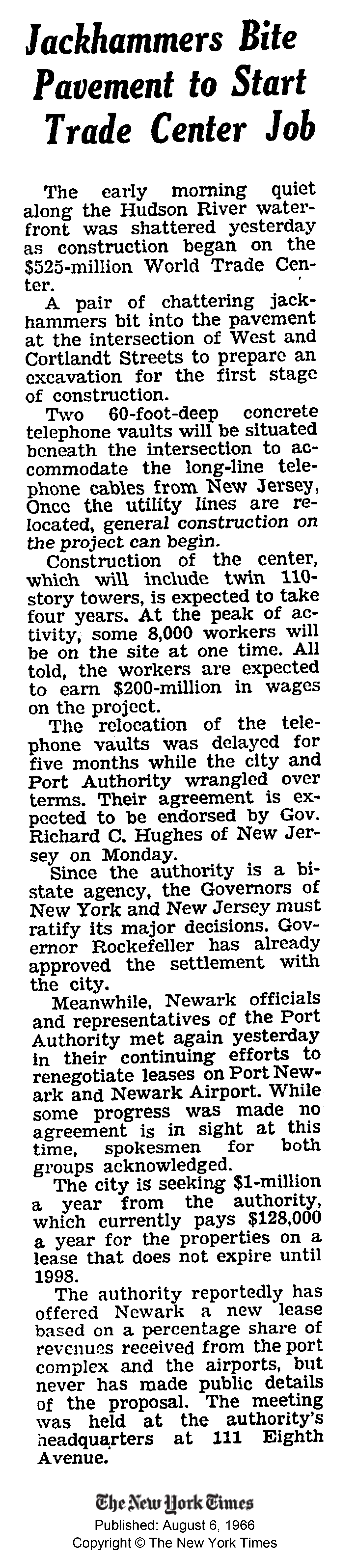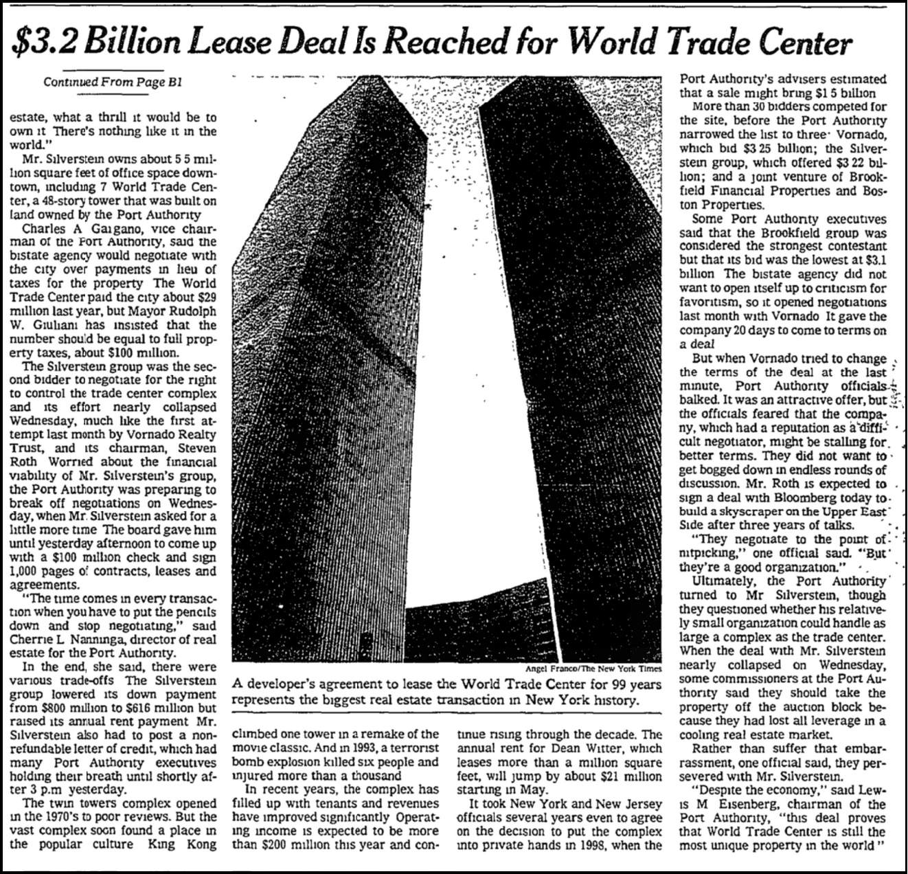 I don’t know the precise time Larry closed the infamous 99-year lease with the Port Authority on July 24 of 2001, so I am defaulting to 10 am. If anyone has better data, please drop me a line. The pre-deal deal was made “shortly after 3 pm” on April 26. 2001.