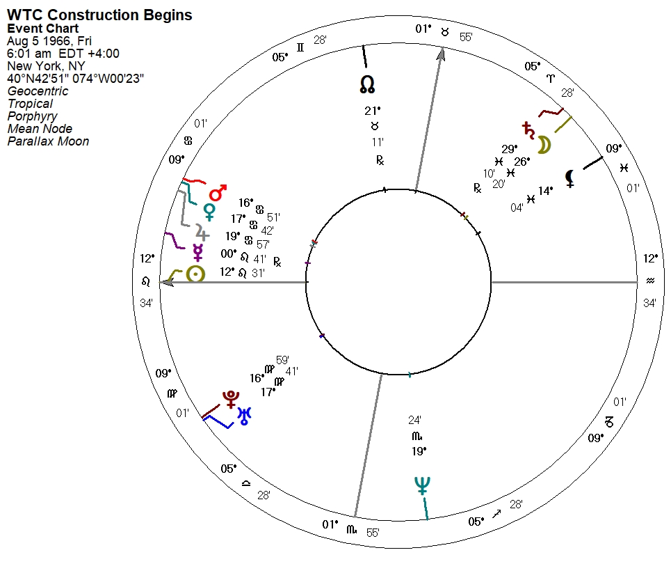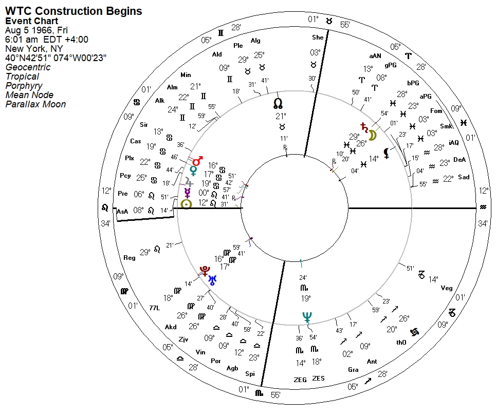 As we approach the second Saturn Return of the beginning of construction of the WTC, some analysis may be useful. The sunrise chart shows Saturn in the last degree of Pisces with an applying conjunction from the Moon: