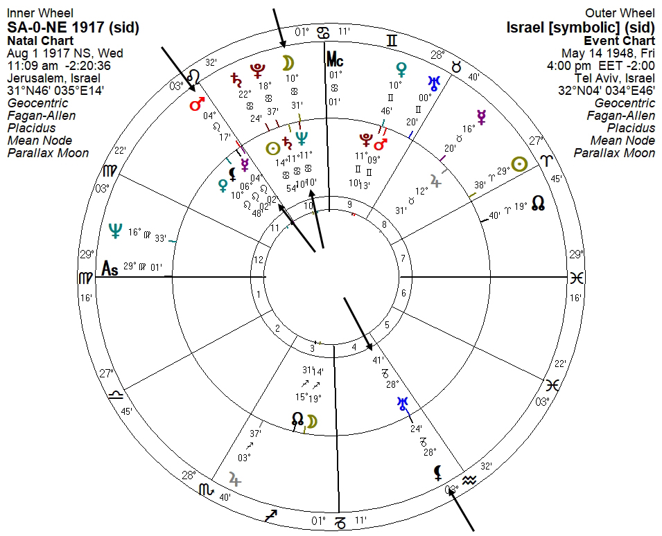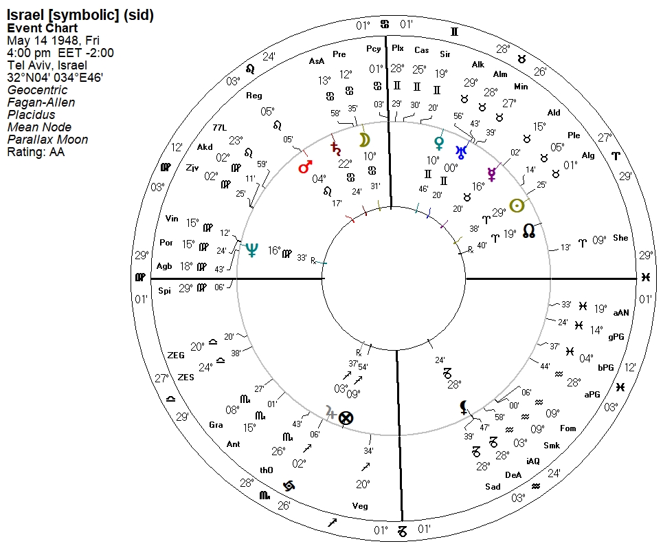 A bi-wheel with the State of Israel symbolic chart shows that Israel’s Moon is aligned snugly with the 1717 Saturn/Neptune conjunction, as well as other connections of interest: