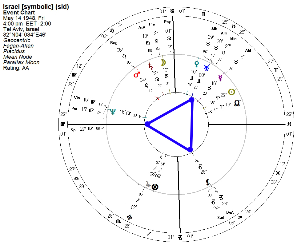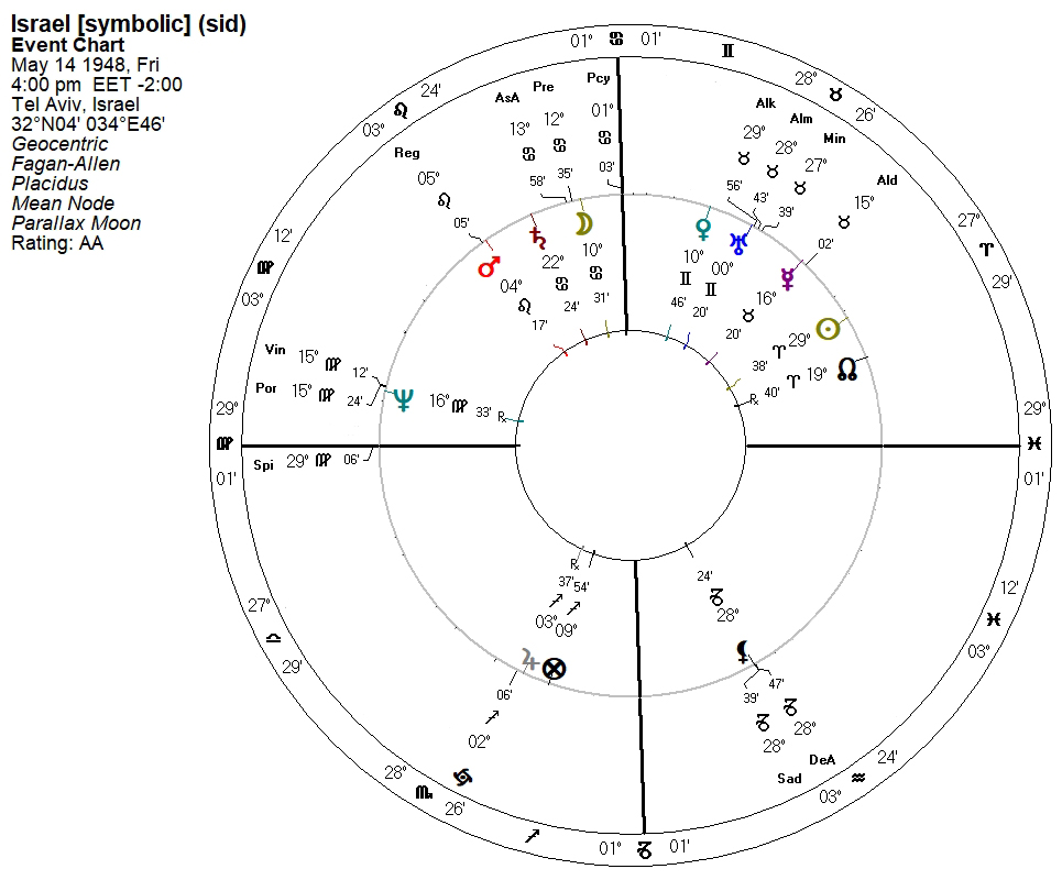 It should come as no surprise that the astrological moment for the declaration of the State of Israel, in 1948, would place Spica [Spi] right on the eastern horizon. Using the Fagan zodiac with my array of major fixed stars, Spica is on the far left as the ascendant: