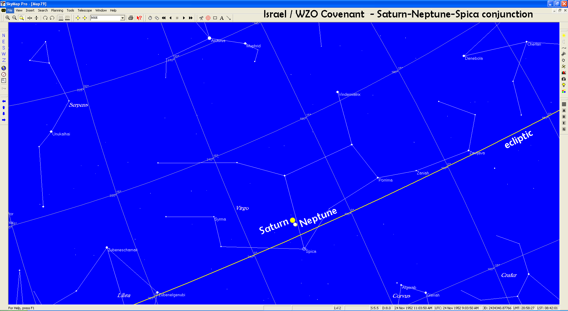 The Sky Map below shows the nearly perfect alignment of Saturn and Neptune with Spica: