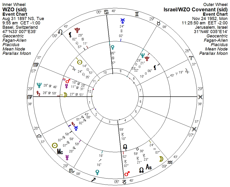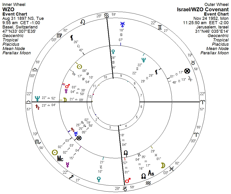My radix for the WZO – which was originally simply called the Zionist Congress – places Venus on the midheaven and a Moon/Spica conjunction on the ascendant. A bi-wheel for the the WZO and the Israel/WZO Covenant shows the 1952 occursion on the WZO ascendant and Moon. The two occursions with Saturn are basically 33° apart in longitude: