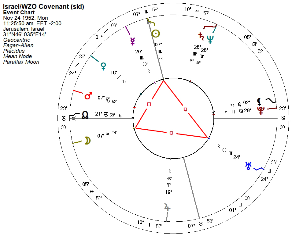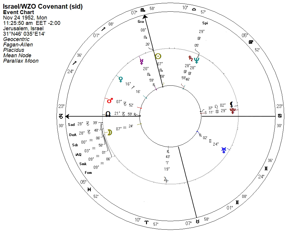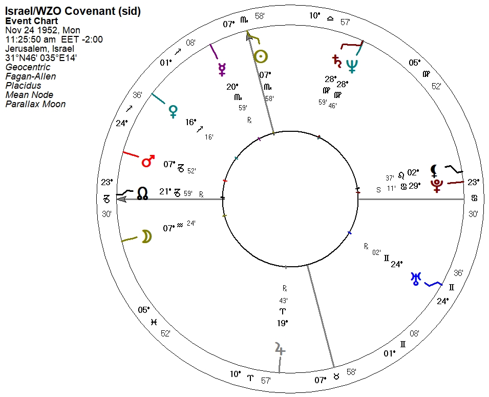 I want to jump ahead to the World Zionist Organization-Jewish Agency (Status) Law as it was passed during the Saturn/Neptune occursion of 1952-3. Switching to the Fagan zodiac, the noon chart (which I am calling the Israel/WZO Covenant) is as follows: