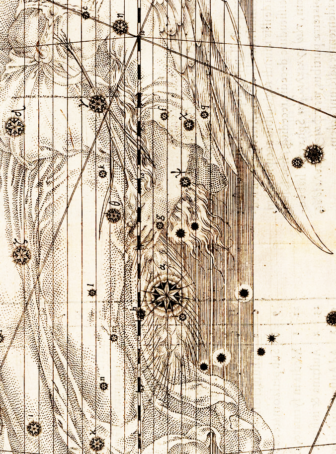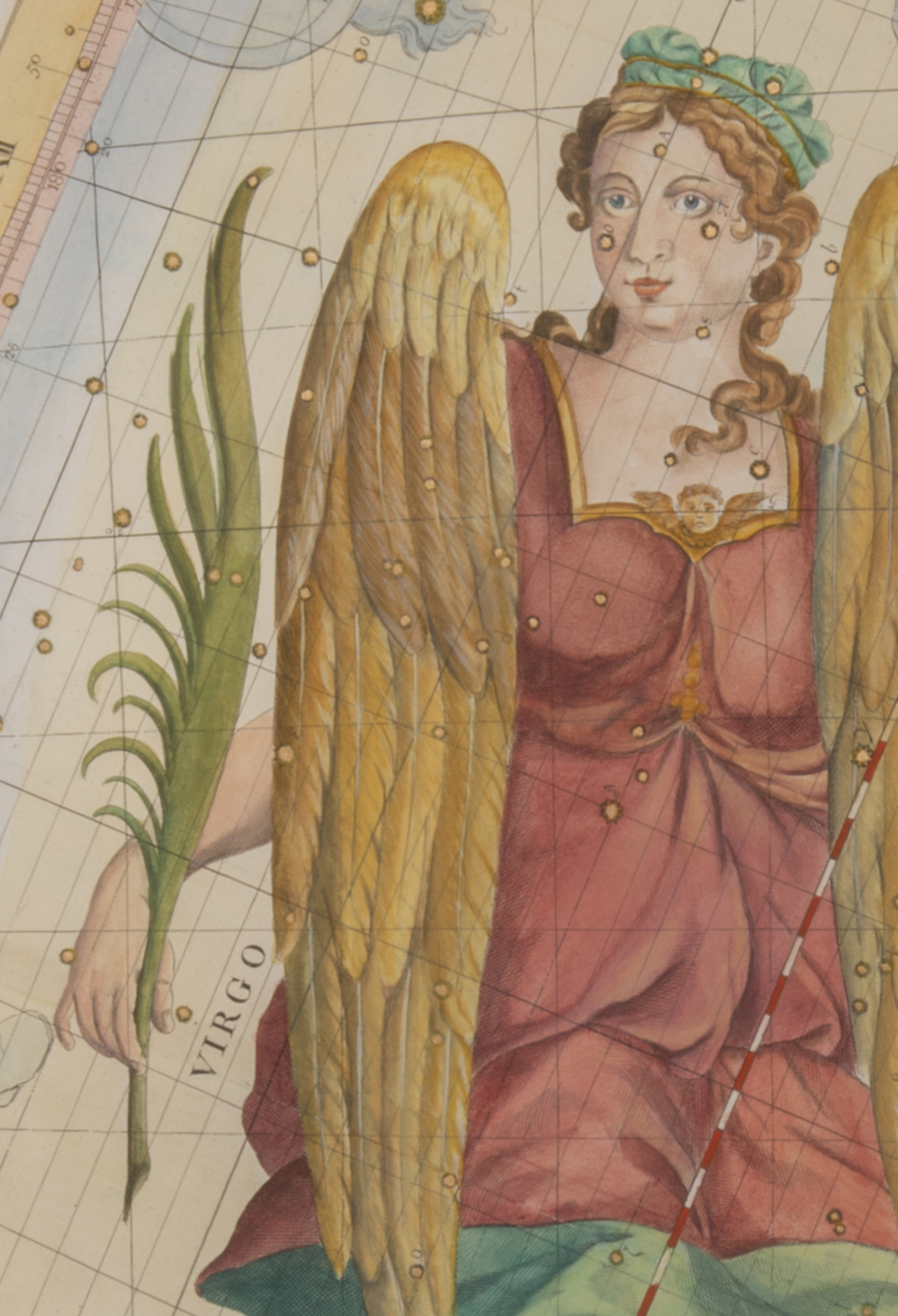 Before the constellational figure of “Virgo” as a female entered the heavenly lexicon, there were only smaller, simpler components. The graphic above shows wheat as the alpha star of Virgo – Spica. We now know the ancients referred to this as the “furrow,” with the star standing alone. In the figure’s right hand, she holds a frond, symbolic of the date tree. The “frond” was a separate constellation before the Hellenistic period, which included the star we now call Vindemiatrix, and other stars up toward the area we now call Coma Berenices.