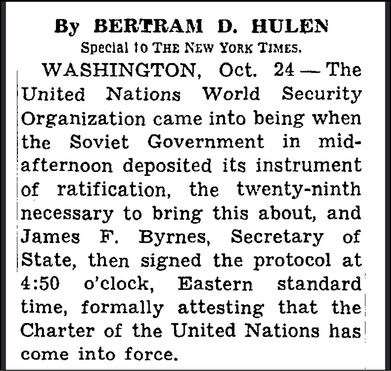 For the UN, the final approval needed was from the Soviet Union. We have a good source for the time-of-day that the official signature was appended to the paperwork that the USSR submitted. The Soviet plan was to submit the paperwork at a time (3:07 pm), giving enough time for the documents to be inspected, authenticated, and deposited on the symbolic anniversary of the October Revolution: 4:50 pm on October 24 at Washington DC coincides with 12:50 am of October 25 in Moscow.
